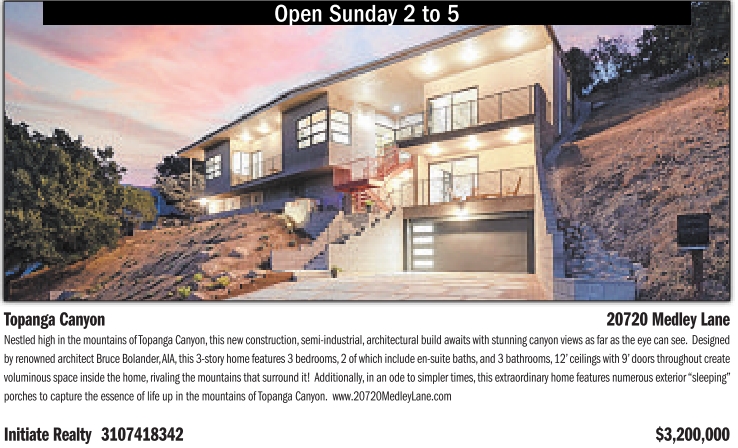 Nestled high in the mountains ofTopanga Canyon,this new construction,semi-industrial,architectural build awaits with stunning canyon views as far as the eye can see. Designed by renowned architect Bruce Bolander,AIA,this 3-story home features 3 bedrooms,2 of which include en-suite baths,and 3 bathrooms,12’ceilings with 9’doors throughout create voluminous space inside the home,rivaling the mountains that surround it! Additionally,in an ode to simpler times,this extraordinary home features numerous exterior“sleeping” porches to capture the essence of life up in the mountains of Topanga Canyon. www.20720MedleyLane.com
