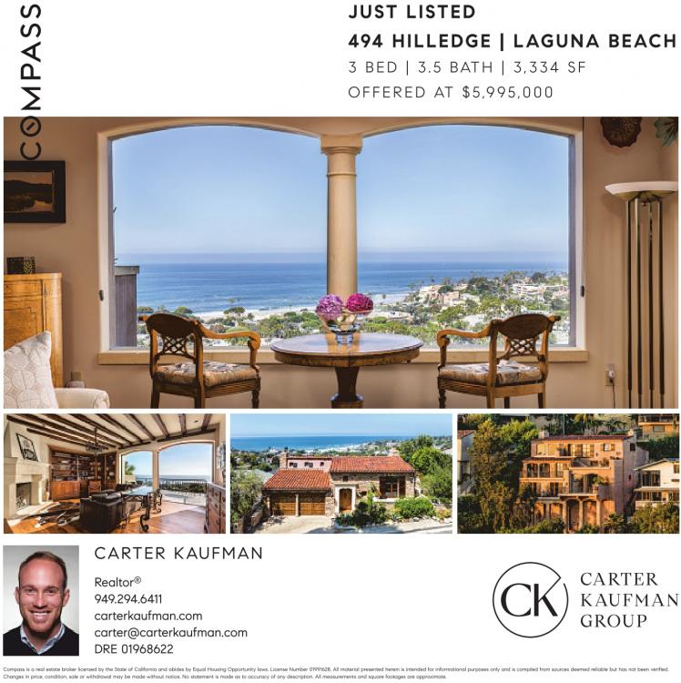 JUST LISTED 494 HILLEDGE | LAGUNA BEACH 3 BED | 3.5 BATH | 3, 334 SF OFFERED AT $5,995,000 CARTER KAUFMAN Realtor ® 949.294.6411 carterkaufman.com carter@carterkaufman.com DRE 01968622 Compass is a real estate broker licensed by the State of California and abides by Equal Housing Opportunity laws. License Number 01991628. All material presented herein is intended for informational purposes only and is compiled from sources deemed reliable but has not been verified. Changes in price, condition, sale or withdrawal may be made without notice. No statement is made as to accuracy of any description. All measurements and square footages are approximate.