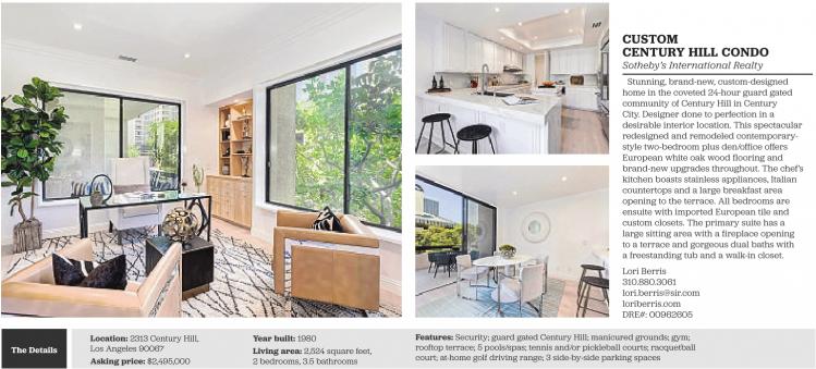 The Details Location: 2313 Century Hill, Los Angeles 90067 Asking price: $2,495,000 Year built: 1980 Living area: 2,524 square feet, 2 bedrooms, 3.5 bathrooms CUSTOM CENTURY HILL CONDO Sotheby’s International Realty Stunning, brand-new, custom-designed home in the coveted 24-hour guard gated community of Century Hill in Century City. Designer done to perfection in a desirable interior location. This spectacular redesigned and remodeled contemporarystyle two-bedroom plus den/office offers European white oak wood flooring and brand-new upgrades throughout. The chef’s kitchen boasts stainless appliances, Italian countertops and a large breakfast area opening to the terrace. All bedrooms are ensuite with imported European tile and custom closets. The primary suite has a large sitting area with a fireplace opening to a terrace and gorgeous dual baths with a freestanding tub and a walk-in closet. Lori Berris 310.880.3061 lori.berris@sir.com loriberris.com DRE#: 00962605 Features: Security; guard gated Century Hill; manicured grounds; gym; rooftop terrace; 5 pools/spas; tennis and/or pickleball courts; racquetball court; at-home golf driving range; 3 side-by-side parking spaces See also