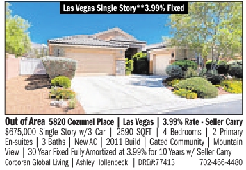 Las Vegas Single Story**3.99% Fixed Out of Area 5820 Cozumel Place | Las Vegas | 3.99% Rate - Seller Carry $675,000 Single Story w/3 Car | 2590 SQFT | 4 Bedrooms | 2 Primary En-suites | 3 Baths | New AC | 2011 Build | Gated Community | Mountain View | 30 Year Fixed Fully Amortized at 3.99% for 10 Years w/ Seller Carry Corcoran Global Living | Ashley Hollenbeck | DRE#:77413 702-466-4480