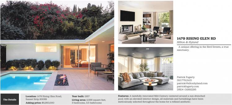 The Details Location: 1479 Rising Glen Road, Sunset Strip 90069 Asking price: $5,950,000 Year built: 1957 Living area: 2,566 square feet, 3 bedrooms, 3.5 bathrooms 1479 RISING GLEN RD Hilton & Hyland A unique offering in the Bird Streets, a true sanctuary. Patrick Fogarty 310.779.2415 patrick@hiltonhyland.com patrickfogarty.com DRE#: 01992295 Features: A tastefully renovated Mid-Century centered around a sun-drenched pool; with an elevated interior design, all materials and furnishings have been meticulously selected throughout the home for a refined aesthetic. See also