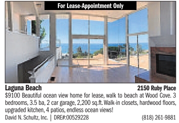 Laguna Beach 2150 Ruby Place $9100 Beautiful ocean view home for lease, walk to beach at Wood Cove. 3 bedrooms, 3.5 ba, 2 car garage, 2,200 sq.ft.Walk-in closets, hardwood floors, upgraded kitchen, 4 patios, endless ocean views! David N. Schultz, Inc. | DRE#:00529228 (818) 261-9881