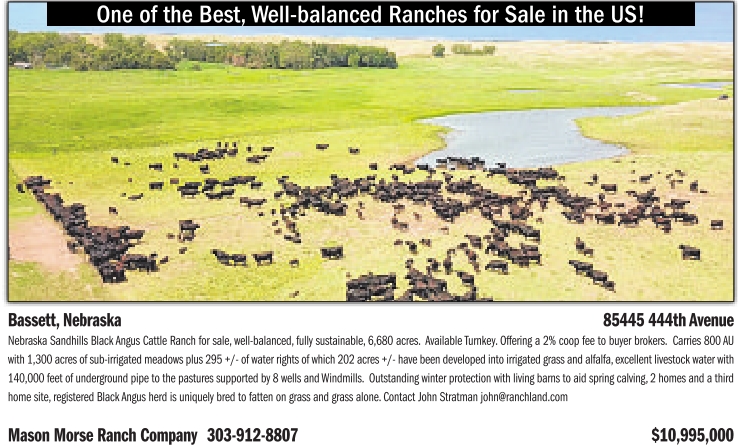 One of the Best, Well-balanced Ranches for Sale in the US! Bassett, Nebraska 85445 444th Avenue Nebraska Sandhills Black Angus Cattle Ranch for sale, well-balanced, fully sustainable, 6,680 acres. Available Turnkey. Offering a 2% coop fee to buyer brokers. Carries 800 AU with 1,300 acres of sub-irrigated meadows plus 295 +/- of water rights of which 202 acres +/- have been developed into irrigated grass and alfalfa,excellent livestock water with 140,000 feet of underground pipe to the pastures supported by 8 wells and Windmills. Outstanding winter protection with living barns to aid spring calving, 2 homes and a third home site, registered Black Angus herd is uniquely bred to fatten on grass and grass alone. Contact John Stratman john@ranchland.com Mason Morse Ranch Company 303-912-8807 $10,995,000