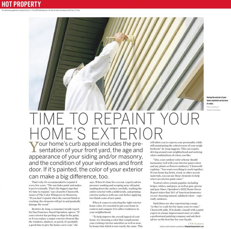 Beatrice de Jong, a consumer trends expert for San Francisco-based Opendoor, agrees. “If your exterior has peeling or chips in the paint, or if you replace a major exterior element like the windows, shutters, or porch, it’s probably a good time to give the home a new coat,” she