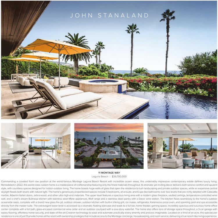 11 MONTAGE WAY Laguna Beach | $39,700,000 Commanding a coveted front row position at the world-famous Montage Laguna Beach Resort with incredible ocean views, this undeniably impressive contemporary estate defines luxury living. Remodeled in 2022, this world-class custom home is a masterpiece of craftsmanship featuring only the finest materials throughout. Its dramatic yet inviting decor delivers both serene comfort and opulent style, with countless spaces designed for indoor-outdoor living. The home boasts huge walls of glass that open the residence to lush landscaping and private outdoor spaces, while an expansive central skylight floods both levels with natural light. The home’s generously proportioned spaces include 5 bedrooms, all ensuite, and 6 spa-like bathrooms over two levels that are richly detailed with Calacatta marble, Albertini Italian doors, zebra wood, and other ultra high-end materials. The upper level features a spacious living area with a modern glass fireplace, vaulted ceilings, temperature-controlled wine wall, and a chef’s dream Bulthaup kitchen with stainless steel Miele appliances, Wolf range and a stainless steel pantry with a Dacor wine station. The kitchen flows seamlessly to the home’s outdoor oceanside oasis, complete with a brand new glass fire pit, outdoor shower, outdoor kitchen with built-in Viking grill, ice maker, refrigerator, Kalamazoo pizza oven, and sparkling pool and spa accessible directly from the master suite. The extravagant lower level is accessed via a dramatic floating staircase and leads to a full bar, home theater, gaming space, incredibly spacious and luxurious home office center complete with a full bath, glass-encased commercial wine cellar and an outdoor courtyard with a one-story waterfall. The home also offers tons of storage space throughout, a 3-car garage with epoxy flooring, effortless home security, and state-of-the-art Crestron technology to ease and automate practically every amenity and process imaginable. Located on a third of an acre, this spectacular residence is one of just 13 private homes at the resort with ownership privileges that include access to the Montage concierge, housekeeping, and room service, delivering a true resort-like living experience.