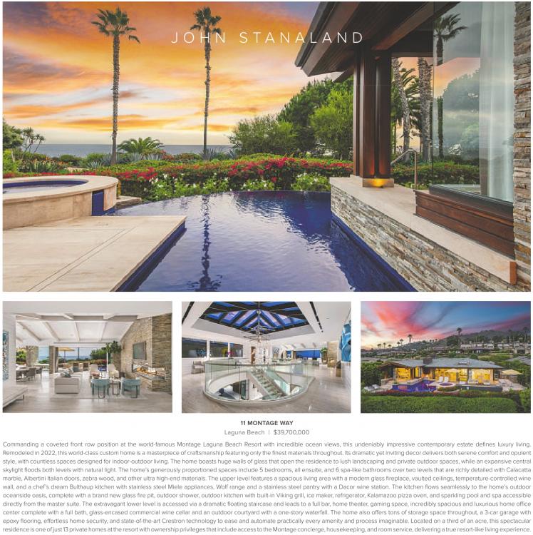 11 MONTAGE WAY Laguna Beach | $39,700,000 Commanding a coveted front row position at the world-famous Montage Laguna Beach Resort with incredible ocean views, this undeniably impressive contemporary estate defines luxury living. Remodeled in 2022, this world-class custom home is a masterpiece of craftsmanship featuring only the finest materials throughout. Its dramatic yet inviting decor delivers both serene comfort and opulent style, with countless spaces designed for indoor-outdoor living. The home boasts huge walls of glass that open the residence to lush landscaping and private outdoor spaces, while an expansive central skylight floods both levels with natural light. The home’s generously proportioned spaces include 5 bedrooms, all ensuite, and 6 spa-like bathrooms over two levels that are richly detailed with Calacatta marble, Albertini Italian doors, zebra wood, and other ultra high-end materials. The upper level features a spacious living area with a modern glass fireplace, vaulted ceilings, temperature-controlled wine wall, and a chef’s dream Bulthaup kitchen with stainless steel Miele appliances, Wolf range and a stainless steel pantry with a Dacor wine station. The kitchen flows seamlessly to the home’s outdoor oceanside oasis, complete with a brand new glass fire pit, outdoor shower, outdoor kitchen with built-in Viking grill, ice maker, refrigerator, Kalamazoo pizza oven, and sparkling pool and spa accessible directly from the master suite. The extravagant lower level is accessed via a dramatic floating staircase and leads to a full bar, home theater, gaming space, incredibly spacious and luxurious home office center complete with a full bath, glass-encased commercial wine cellar and an outdoor courtyard with a one-story waterfall. The home also offers tons of storage space throughout, a 3-car garage with epoxy flooring, effortless home security, and state-of-the-art Crestron technology to ease and automate practically every amenity and process imaginable. Located on a third of an acre, this spectacular residence is one of just 13 private homes at the resort with ownership privileges that include access to the Montage concierge, housekeeping, and room service, delivering a true resort-like living experience.