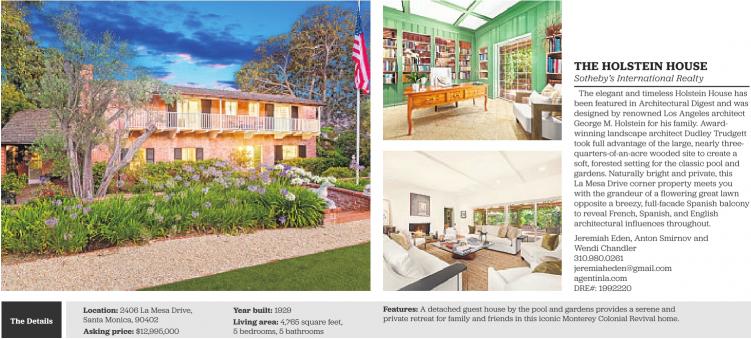 The elegant and timeless Holstein House has been featured in Architectural Digest and was designed by renowned Los Angeles architect George M. Holstein for his family. Awardwinning landscape architect Dudley Trudgett took full advantage of the large, nearly threequarters-of-an-acre wooded site to create a soft, forested setting for the classic pool and gardens. Naturally bright and private, this La Mesa Drive corner property meets you with the grandeur of a flowering great lawn opposite a breezy, full-facade Spanish balcony to reveal French, Spanish, and English architectural influences throughout.