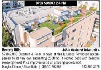Beverly Hills 448 N Oakhurst Drive Unit 4 $2,849,000 Entertain & Relax in Style at this luxurious Penthouse accompanied by its very own enchanting 2600 Sq Ft rooftop deck with beautiful sweeping views! Price improvement & an amazing opportunity! Douglas Elliman / Alison Betts | DRE#:01392565 323-309-3976
