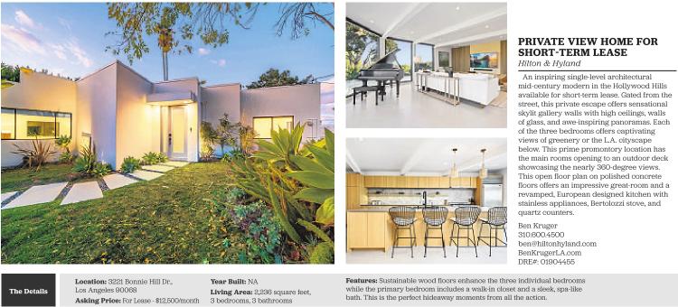 An inspiring single-level architectural mid-century modern in the Hollywood Hills available for short-term lease. Gated from the street, this private escape offers sensational skylit gallery walls with high ceilings, walls of glass, and awe-inspiring panoramas. Each of the three bedrooms offers captivating views of greenery or the L.A. cityscape below. This prime promontory location has the main rooms opening to an outdoor deck showcasing the nearly 360-degree views. This open floor plan on polished concrete floors offers an impressive great-room and a revamped, European designed kitchen with stainless appliances, Bertolozzi stove, and quartz counters.