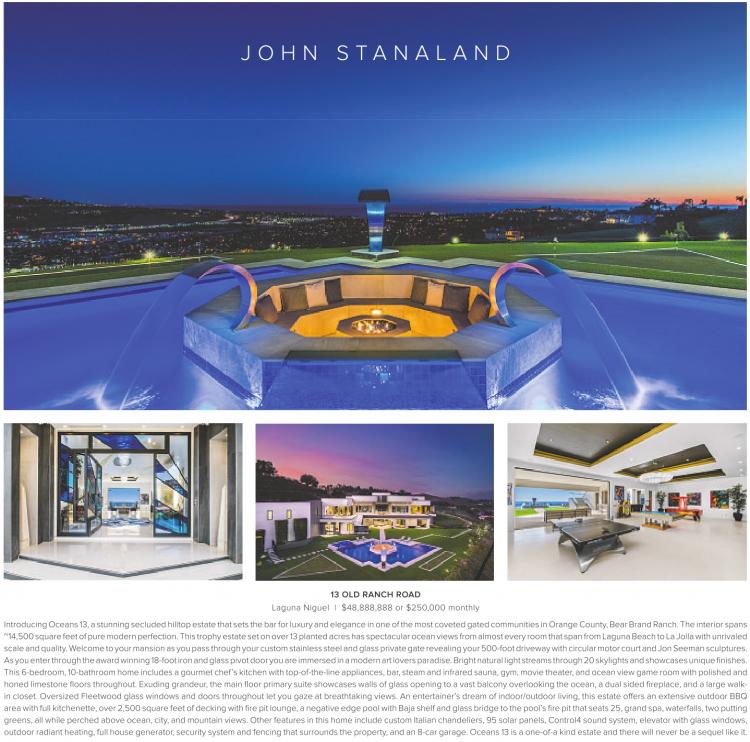 13 OLD RANCH ROAD Laguna Niguel | $48,888,888 or $250,000 monthly Introducing Oceans 13, a stunning secluded hilltop estate that sets the bar for luxury and elegance in one of the most coveted gated communities in Orange County, Bear Brand Ranch. The interior spans ~14,500 square feet of pure modern perfection. This trophy estate set on over 13 planted acres has spectacular ocean views from almost every room that span from Laguna Beach to La Jolla with unrivaled scale and quality. Welcome to your mansion as you pass through your custom stainless steel and glass private gate revealing your 500-foot driveway with circular motor court and Jon Seeman sculptures. As you enter through the award winning 18-foot iron and glass pivot door you are immersed in a modern art lovers paradise. Bright natural light streams through 20 skylights and showcases unique finishes. This 6-bedroom, 10-bathroom home includes a gourmet chef’s kitchen with top-of-the-line appliances, bar, steam and infrared sauna, gym, movie theater, and ocean view game room with polished and honed limestone floors throughout. Exuding grandeur, the main floor primary suite showcases walls of glass opening to a vast balcony overlooking the ocean, a dual sided fireplace, and a large walkin closet. Oversized Fleetwood glass windows and doors throughout let you gaze at breathtaking views. An entertainer’s dream of indoor/outdoor living, this estate offers an extensive outdoor BBQ area with full kitchenette, over 2,500 square feet of decking with fire pit lounge, a negative edge pool with Baja shelf and glass bridge to the pool’s fire pit that seats 25, grand spa, waterfalls, two putting greens, all while perched above ocean, city, and mountain views. Other features in this home include custom Italian chandeliers, 95 solar panels, Control4 sound system, elevator with glass windows, outdoor radiant heating, full house generator, security system and fencing that surrounds the property, and an 8-car garage. Oceans 13 is a one-of-a kind estate and there will never be a sequel like it.