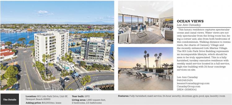 The Details Location: 601 Lido Park Drive, Unit 6F, Newport Beach 92663 Asking price: $15,000/mo. lease Year built: 1972 Living area: 1,860 square feet, 2 bedrooms, 2.5 bathrooms OCEAN VIEWS Lee Ann Canaday This luxury residence captures spectacular ocean and canal views. Water views are not only spectacular from the living room but, being a corner unit, also from both bedrooms of this condominium. Walking distance to restaurants, the charm of Cannery Village and the recently enhanced Lido Marina Village. The 601 Lido Park Drive Building represents an incomparable lifestyle, which should be seen to be truly appreciated. This is a fully furnished, turnkey executive residence with weekly maid service located in a full-service, high-rise building with 24-hour concierge services on-site. Lee Ann Canaday 949.249.2424 leeann@canadaygroup.com CanadayGroup.com DRE#: 00560041 Features: Fully furnished; maid service; 24-hour security; doorman; gym; pool; spa; laundry room See also