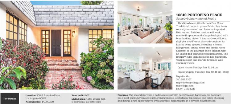 This 5-bedroom, 5-bathroom East Coast Traditional home in prime Bel-Air has been recently renovated and features imported fixtures and finishes, custom millwork, marble fireplaces and a large backyard with breathtaking views. It has hardwood floors, skylights and French doors throughout its luxury living spaces, including a formal living room, dining room and family room adjacent to the gourmet chef’s kitchen with an island and stainless steel appliances. The primary suite includes a spa-like bathroom, walk-in closet and marble fireplace with stunning views.