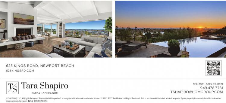 625 KINGS ROAD, NEWPORT BEACH 625KINGSRD.COM REALTOR ® | DRE# 01892201 949.478.7781 TSHAPIRO@HOMGROUP.COM © 2022 FGP, LLC. All Rights Reserved. Forbes Global Properties® is a registered trademark used under license. © 2022 EQTY Real Estate. All Rights Reserved. This is not intended to solicit a listed property. If your property is currently listed for sale with a broker, please disregard. DRE# 02014153