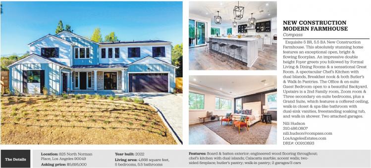 The Details Location: 825 North Norman Place, Los Angeles 90049 Asking price: $5,695,000 Year built: 2022 Living area: 4,668 square feet, 5 bedrooms, 5.5 bathrooms NEW CONSTRUCTION MODERN FARMHOUSE Compass Exquisite 5 BR, 5.5 BA New Construction Farmhouse. This absolutely stunning home features an exceptional open, bright & flowing floorplan. An impressive double height Foyer greets you followed by Formal Living & Dining Rooms & a sensational Great Room. A spectacular Chef’s Kitchen with dual Islands, Breakfast nook & both Butler’s & Walk-In Pantries. The Office & en-suite Guest Bedroom open to a beautiful Backyard. Upstairs is a 2nd Family room, Zoom room & Three secondary en-suite bedrooms, plus a Grand Suite, which features a coffered ceiling, walk-in closet & spa-like bathroom with dual-sink vanities, freestanding soaking tub, and walk-in shower. Two attached garages. Nili Hudson 310.486.0807 nili.hudson@compass.com LosAngelesEstates.com DRE#: 00910893 Features: Board & batten exterior; engineered wood flooring throughout; chef’s kitchen with dual islands; Calacatta marble; accent walls; twosided fireplace; butler’s pantry; walk-in pantry; 2 garages/3 cars See also
