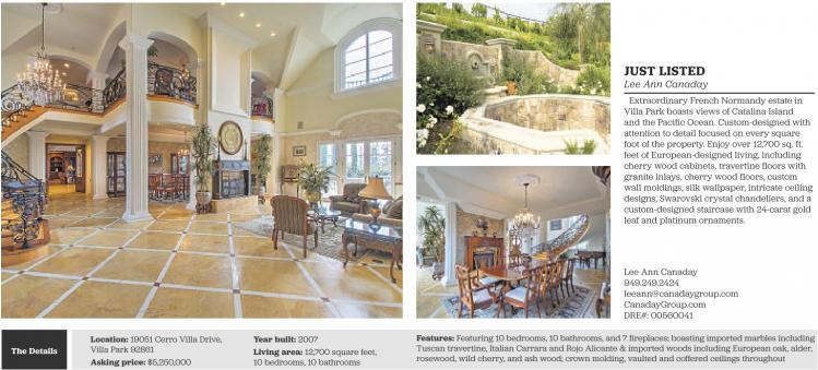 Extraordinary French Normandy estate in Villa Park boasts views of Catalina Island and the Pacific Ocean. Custom-designed with attention to detail focused on every square foot of the property. Enjoy over 12,700 sq. ft. feet of European-designed living, including cherry wood cabinets, travertine floors with granite inlays, cherry wood floors, custom wall moldings, silk wallpaper, intricate ceiling designs, Swarovski crystal chandeliers, and a custom-designed staircase with 24-carat gold leaf and platinum ornaments.