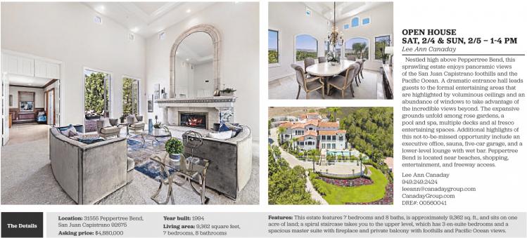 Nestled high above Peppertree Bend, this sprawling estate enjoys panoramic views of the San Juan Capistrano foothills and the Pacific Ocean. A dramatic entrance hall leads guests to the formal entertaining areas that are highlighted by voluminous ceilings and an abundance of windows to take advantage of the incredible views beyond. The expansive grounds unfold among rose gardens, a pool and spa, multiple decks and al fresco entertaining spaces. Additional highlights of this not-to-be-missed opportunity include an executive office, sauna, five-car garage, and a lower-level lounge with wet bar. Peppertree Bend is located near beaches, shopping, entertainment, and freeway access.