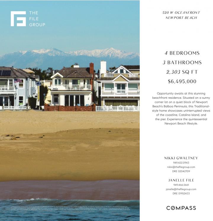 Compass is a real estate broker licensed by the state of California and abides by equal housing opportunity laws. License number 01527365. All material presented herein is intended for informational purposes only. Information is compiled from sources deemed reliable but is subject to errors, omissions, changes in price, condition, sale, or withdrawal without notice. No statement is made as to accuracy of any description. All measurements and square footages are approximate. This is not intended to solicit property already listed. Nothing herein shall be construed as legal, accounting or other professional advice outside the realm of real estate. 520 W OCEANFRONT NEWP ORT BEACH 4 BEDROOMS 3 BATHROOMS 2,303 SQ FT $6,495,000 Opportunity awaits at this stunning beachfront residence. Situated on a sunny corner lot on a quiet block of Newport Beach’s Balboa Peninsula, this Traditionalstyle home showcases uninterrupted views of the coastline, Catalina Island, and the pier. Experience the quintessential Newport Beach lifestyle. NIKKI GWALTNEY 949.422.0943 nikki@thefilegroup.com DRE 02042709 JANELLE FILE 949.466.5661 janelle@thefilegroup.com DRE 01952433