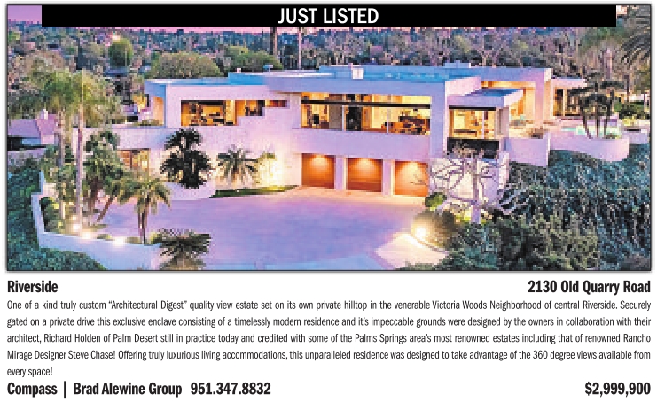 JUST LISTED Riverside 2130 Old Quarry Road One of a kind truly custom “Architectural Digest” quality view estate set on its own private hilltop in the venerable Victoria Woods Neighborhood of central Riverside. Securely gated on a private drive this exclusive enclave consisting of a timelessly modern residence and it’s impeccable grounds were designed by the owners in collaboration with their architect, Richard Holden of Palm Desert still in practice today and credited with some of the Palms Springs area’s most renowned estates including that of renowned Rancho Mirage Designer Steve Chase! Offering truly luxurious living accommodations, this unparalleled residence was designed to take advantage of the 360 degree views available from every space! Compass | Brad Alewine Group 951.347.8832 $2,999,900