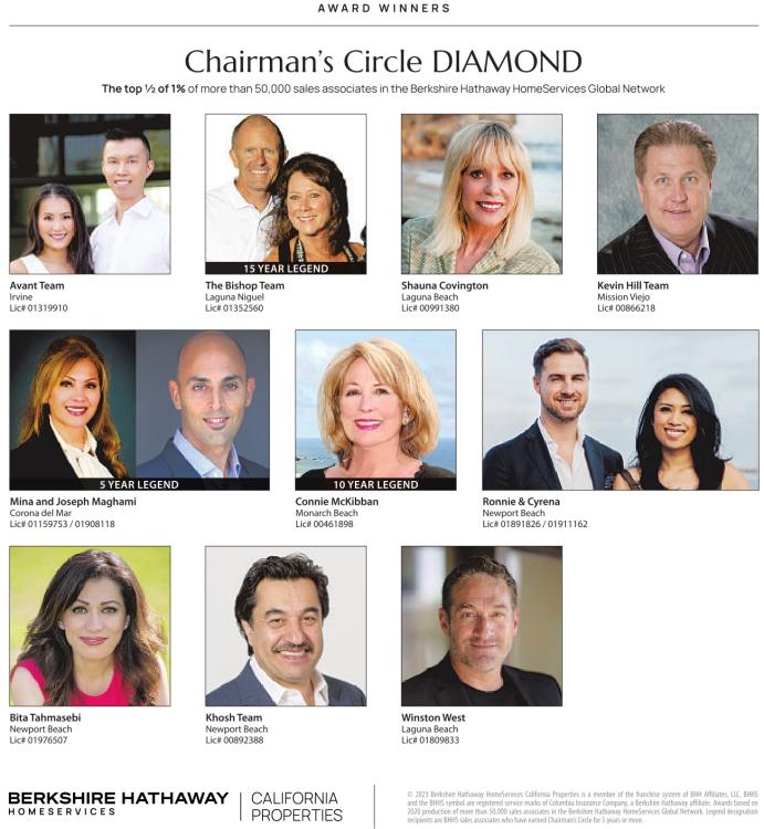 A W A R D W I N N E R S Chairman’s Circle DIAMOND The top ½ of 1% of more than 50,000 sales associates in the Berkshire Hathaway HomeServices Global Network Avant Team Irvine Lic# 01319910 15 YEAR LEGEND The Bishop Team Laguna Niguel Lic# 01352560 Shauna Covington Laguna Beach Lic# 00991380 Kevin Hill Team Mission Viejo Lic# 00866218 Mina and Joseph Maghami Corona del Mar Lic# 01159753 / 01908118 5 YEAR LEGEND 10 YEAR LEGEND Connie McKibban Monarch Beach Lic# 00461898 Ronnie & Cyrena Newport Beach Lic# 01891826 / 01911162 Bita Tahmasebi Newport Beach Lic# 01976507 Khosh Team Newport Beach Lic# 00892388 Winston West Laguna Beach Lic# 01809833 © 2023 Berkshire Hathaway HomeServices California Properties is a member of the franchise system of BHH Affiliates, LLC. BHHS and the BHHS symbol are registered service marks of Columbia Insurance Company, a Berkshire Hathaway affiliate. Awards based on 2020 production of more than 50,000 sales associates in the Berkshire Hathaway HomeServices Global Network. Legend designation recipients are BHHS sales associates who have earned Chairman’s Circle for 5 years or more. See also