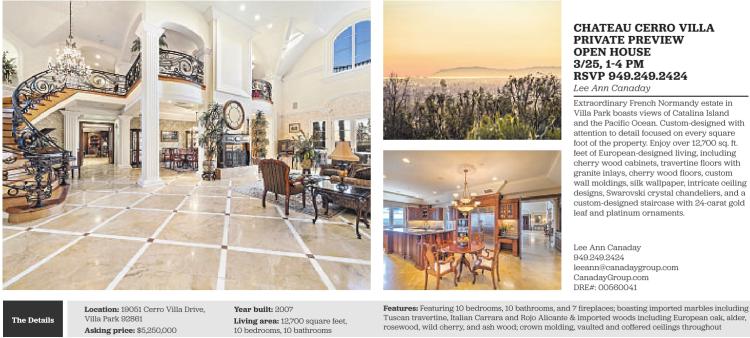 Extraordinary French Normandy estate in Villa Park boasts views of Catalina Island and the Pacific Ocean. Custom-designed with attention to detail focused on every square foot of the property. Enjoy over 12,700 sq. ft. feet of European-designed living, including cherry wood cabinets, travertine floors with granite inlays, cherry wood floors, custom wall moldings, silk wallpaper, intricate ceiling designs, Swarovski crystal chandeliers, and a custom-designed staircase with 24-carat gold leaf and platinum ornaments.