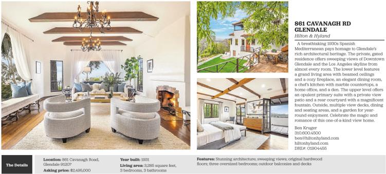 A breathtaking 1930s Spanish Mediterranean pays homage to Glendale’s rich architectural heritage. The private, gated residence offers sweeping views of Downtown Glendale and the Los Angeles skyline from almost every room. The lower level features a grand living area with beamed ceilings and a cozy fireplace, an elegant dining room, a chef’s kitchen with marble countertops, a home office, and a den. The upper level offers an opulent primary suite with a private view patio and a rear courtyard with a magnificent fountain. Outside, multiple view decks, dining and seating areas, and a garden for yearround enjoyment. Celebrate the magic and romance of this one-of-a-kind view home.