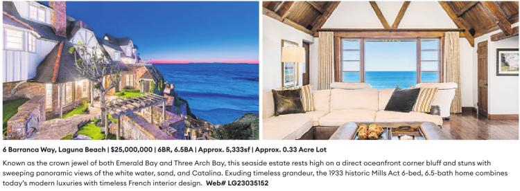 6 Barranca Way, Laguna Beach | $25,000,000 | 6BR, 6.5BA | Approx. 5,333sf | Approx. 0.33 Acre Lot Known as the crown jewel of both Emerald Bay and Three Arch Bay, this seaside estate rests high on a direct oceanfront corner bluff and stuns with sweeping panoramic views of the white water, sand, and Catalina. Exuding timeless grandeur, the 1933 historic Mills Act 6-bed, 6.5-bath home combines today’s modern luxuries with timeless French interior design. Web# LG23035152