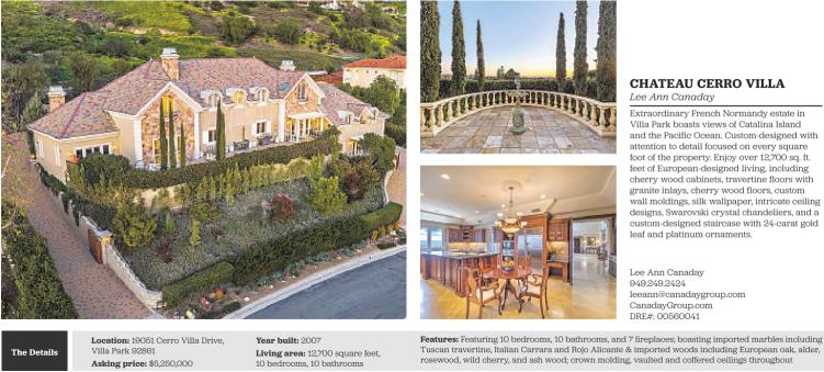 The Details Location: 19051 Cerro Villa Drive, Villa Park 92861 Asking price: $5,250,000 Year built: 2007 Living area: 12,700 square feet, 10 bedrooms, 10 bathrooms CHATEAU CERRO VILLA Lee Ann Canaday Extraordinary French Normandy estate in Villa Park boasts views of Catalina Island and the Pacific Ocean. Custom-designed with attention to detail focused on every square foot of the property. Enjoy over 12,700 sq. ft. feet of European-designed living, including cherry wood cabinets, travertine floors with granite inlays, cherry wood floors, custom wall moldings, silk wallpaper, intricate ceiling designs, Swarovski crystal chandeliers, and a custom-designed staircase with 24-carat gold leaf and platinum ornaments. Lee Ann Canaday 949.249.2424 leeann@canadaygroup.com CanadayGroup.com DRE#: 00560041 Features: Featuring 10 bedrooms, 10 bathrooms, and 7 fireplaces; boasting imported marbles including Tuscan travertine, Italian Carrara and Rojo Alicante & imported woods including European oak, alder, rosewood, wild cherry, and ash wood; crown molding, vaulted and coffered ceilings throughout See also