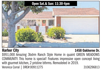 Open Sat.& Sun: 11:30-4pm Harbor City 1458 Oakhorne Dr. $951,000 Amazing 3bdrm Ranch Style Home in quaint GREEN MEADOWS COMMUNITY. This home is special! Features impressive open concept living with gourmet kitchen, 2 pristine bthrms. Remodeled in 2019. Veronica Corral | DRE#:00911275 3106296813