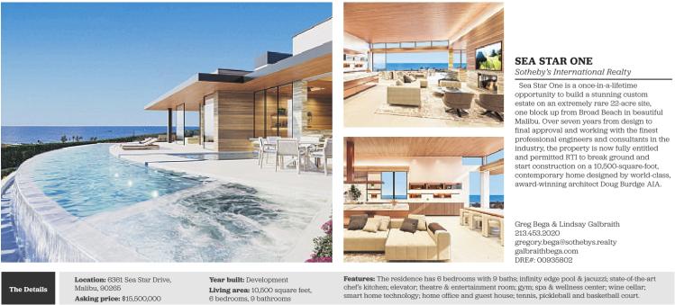 The Details Location: 6361 Sea Star Drive, Malibu, 90265 Asking price: $15,500,000 Year built: Development Living area: 10,500 square feet, 6 bedrooms, 9 bathrooms SEA STAR ONE Sotheby’s International Realty Sea Star One is a once-in-a-lifetime opportunity to build a stunning custom estate on an extremely rare 22-acre site, one block up from Broad Beach in beautiful Malibu. Over seven years from design to final approval and working with the finest professional engineers and consultants in the industry, the property is now fully entitled and permitted RTI to break ground and start construction on a 10,500-square-foot, contemporary home designed by world-class, award-winning architect Doug Burdge AIA. Greg Bega & Lindsay Galbraith 213.453.2020 gregory.bega@sothebys.realty galbraithbega.com DRE#: 00935802 Features: The residence has 6 bedrooms with 9 baths; infinity edge pool & jacuzzi; state-of-the-art chef’s kitchen; elevator; theatre & entertainment room; gym; spa & wellness center; wine cellar; smart home technology; home office and guest house; tennis, pickleball and basketball court. See also