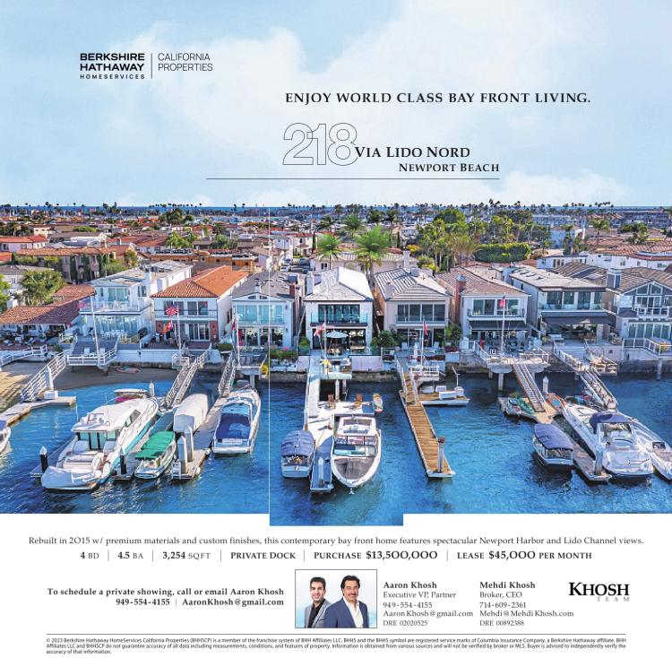 ENJOY WORLD CLASS BAY FRONT LIVING. VIA LIDO NORD NEWPORT BEACH Rebuilt in 2O15 w/ premium materials and custom finishes, this contemporary bay front home features spectacular Newport Harbor and Lido Channel views. 4 BD | 4.5 BA | 3,254 SQ F T | PRIVATE DOCK | PURCHASE $13,5OO,OOO | LEASE $45,OOO PER MONTH To schedule a private showing, call or email Aaron Khosh 949 - 554 - 4155 | AaronKhosh @ gmail.com Aaron Khosh Executive VP, Partner 949 - 554 - 4155 Aaron Khosh @ gmail.com DRE 02020525 Mehdi Khosh Broker, CEO 714 - 609 - 2361 Mehdi @ Mehdi Khosh.com DRE 00892388 © 2023 Berkshire Hathaway HomeServices California Properties (BHHSCP) is a member of the franchise system of BHH Affiliates LLC. BHHS and the BHHS symbol are registered service marks of Columbia Insurance Company, a Berkshire Hathaway affiliate. BHH Affiliates LLC and BHHSCP do not guarantee accuracy of all data including measurements, conditions, and features of property. Information is obtained from various sources and will not be verified by broker or MLS. Buyer is advised to independently verify the accuracy of that information.