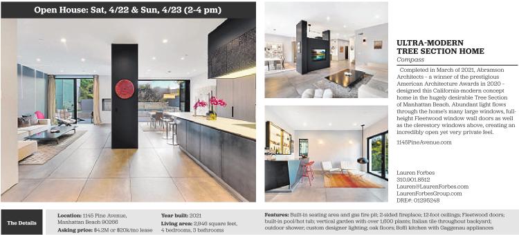 Open House: Sat, 4/22 & Sun, 4/23 (2-4 pm) The Details Location: 1145 Pine Avenue, Manhattan Beach 90266 Asking price: $4.2M or $20k/mo lease Year built: 2021 Living area: 2,946 square feet, 4 bedrooms, 3 bathrooms ULTRA-MODERN TREE SECTION HOME Compass Completed in March of 2021, Abramson Architects – a winner of the prestigious American Architecture Awards in 2020 – designed this California-modern concept home in the hugely desirable Tree Section of Manhattan Beach. Abundant light flows through the home’s many large windows, fullheight Fleetwood window wall doors as well as the clerestory windows above, creating an incredibly open yet very private feel. 1145PineAvenue.com Lauren Forbes 310.901.8512 Lauren@LaurenForbes.com LaurenForbesGroup.com DRE#: 01295248 Features: Built-in seating area and gas fire pit; 2-sided fireplace; 12-foot ceilings; Fleetwood doors; built-in pool/hot tub; vertical garden with over 1,600 plants; Italian tile throughout backyard; outdoor shower; custom designer lighting; oak floors; Boffi kitchen with Gaggenau appliances