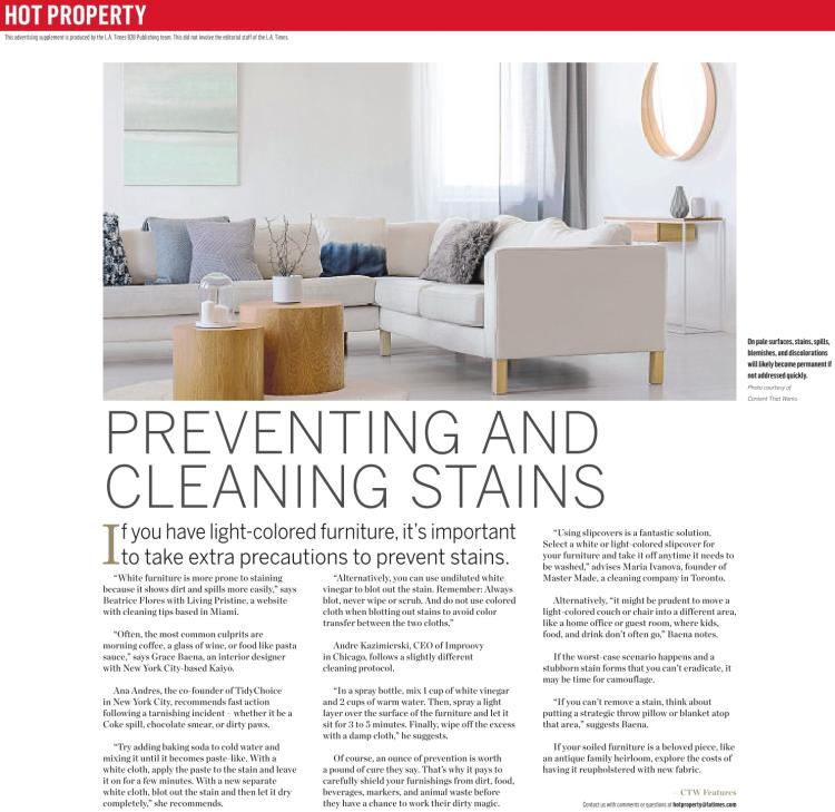 Ana Andres, the co-founder of TidyChoice in New York City, recommends fast action following a tarnishing incident – whether it be a Coke spill, chocolate smear, or dirty paws.