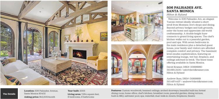 The Details Location: 506 Palisades Avenue, Santa Monica 90402 Asking price: $42,500/month Year built: 2005 Living area: 7,354 square feet, 8 bedrooms, 9 bathrooms 506 PALISADES AVE. SANTA MONICA Hilton & Hyland Welcome to 506 Palisades Ave, an elegant Tuscan retreat ideally situated a short stroll from Montana Ave’s shops and dining. Beyond privacy hedges and lush grounds, enter the home and appreciate old-world craftsmanship. A double-height foyer connects to grand living spaces. The chef’s kitchen walks out to a peaceful garden, pool and spa. With seven bedrooms in the main residence plus a detached guest house, your family and visitors are afforded complete comfort and privacy. The basement level exudes sophistication, featuring an entertaining lounge, wet bar, fireplace, and ceilings adorned in brick. The finest lease offering available in Santa Monica. David Kramer, DRE#: 00996960 310.691.2400 / info@davidkramer.com Hilton & Hyland Andrew Buss, DRE#: 01999869 310.487.4437 / andrew@davidkramer.com Hilton & Hyland Features: Custom woodwork; beamed ceilings; arched doorways; beautiful built-ins; formal dining room; home office; chef’s kitchen; breakfast room; peaceful garden; dining terrace; built-in BBQ; saltwater pool; spa; waterfall; dual walk-in closets; fireplaces; theatre See also