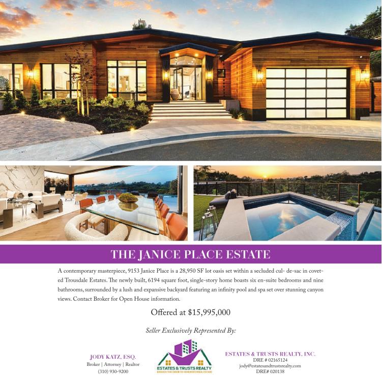 THE JANICE PLACE ESTATE A contemporary masterpiece, 9153 Janice Place is a 28,950 SF lot oasis set within a secluded cul- de-sac in coveted Trousdale Estates. The newly built, 6194 square foot, single-story home boasts six en-suite bedrooms and nine bathrooms, surrounded by a lush and expansive backyard featuring an infinity pool and spa set over stunning canyon views. Contact Broker for Open House information. Offered at $15,995,000 Seller Exclusively Represented By: JODY KATZ, ESQ. Broker | Attorney | Realtor (310) 930-9200 ESTATES & TRUSTS REALTY, INC. DRE # 02165124 jody@estatesandtrustsrealty.com DRE# 020138