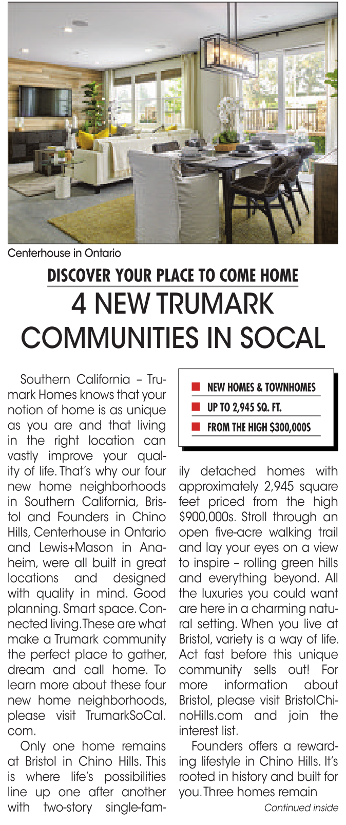 Centerhouse in Ontario DISCOVER YOUR PLACE TO COME HOME 4 NEW TRUMARK COMMUNITIES IN SOCAL Southern California – Trumark Homes knows that your notion of home is as unique as you are and that living in the right location can vastly improve your quality of life. That’s why our four new home neighborhoods in Southern California, Bristol and Founders in Chino Hills,Centerhouse in Ontario and Lewis+Mason in Anaheim, were all built in great locations and designed with quality in mind. Good planning.Smart space.Connected living.These arewhat make a Trumark community the perfect place to gather, dream and call home. To learn more about these four new home neighborhoods, please visit TrumarkSoCal. com. Only one home remains at Bristol in Chino Hills. This is where life’s possibilities line up one after another with two-story single-fam- NEW HOMES &TOWNHOMES UP TO 2,945 SQ. FT. FROM THE HIGH $300,000S ily detached homes with approximately 2,945 square feet priced from the high $900,000s. Stroll through an open five-acre walking trail and lay your eyes on a view to inspire – rolling green hills and everything beyond. All the luxuries you could want are here in a charming natural setting. When you live at Bristol, variety is a way of life. Act fast before this unique community sells out! For more information about Bristol, please visit BristolChinoHills.com and join the interest list. Founders offers a rewarding lifestyle in Chino Hills. It’s rooted in history and built for you.Three homes remain Continued inside