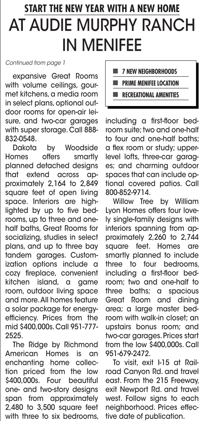 Dakota by Woodside Homes offers smartly planned detached designs that extend across approximately 2,164 to 2,849 square feet of open living space. Interiors are highlighted by up to five bedrooms,up to three and onehalf baths, Great Rooms for socializing, studies in select plans, and up to three bay tandem garages. Customization options include a cozy fireplace, convenient kitchen island, a game room, outdoor living space and more.All homes feature a solar package for energyefficiency. Prices from the mid $400,000s.Call 951-777- 2525.