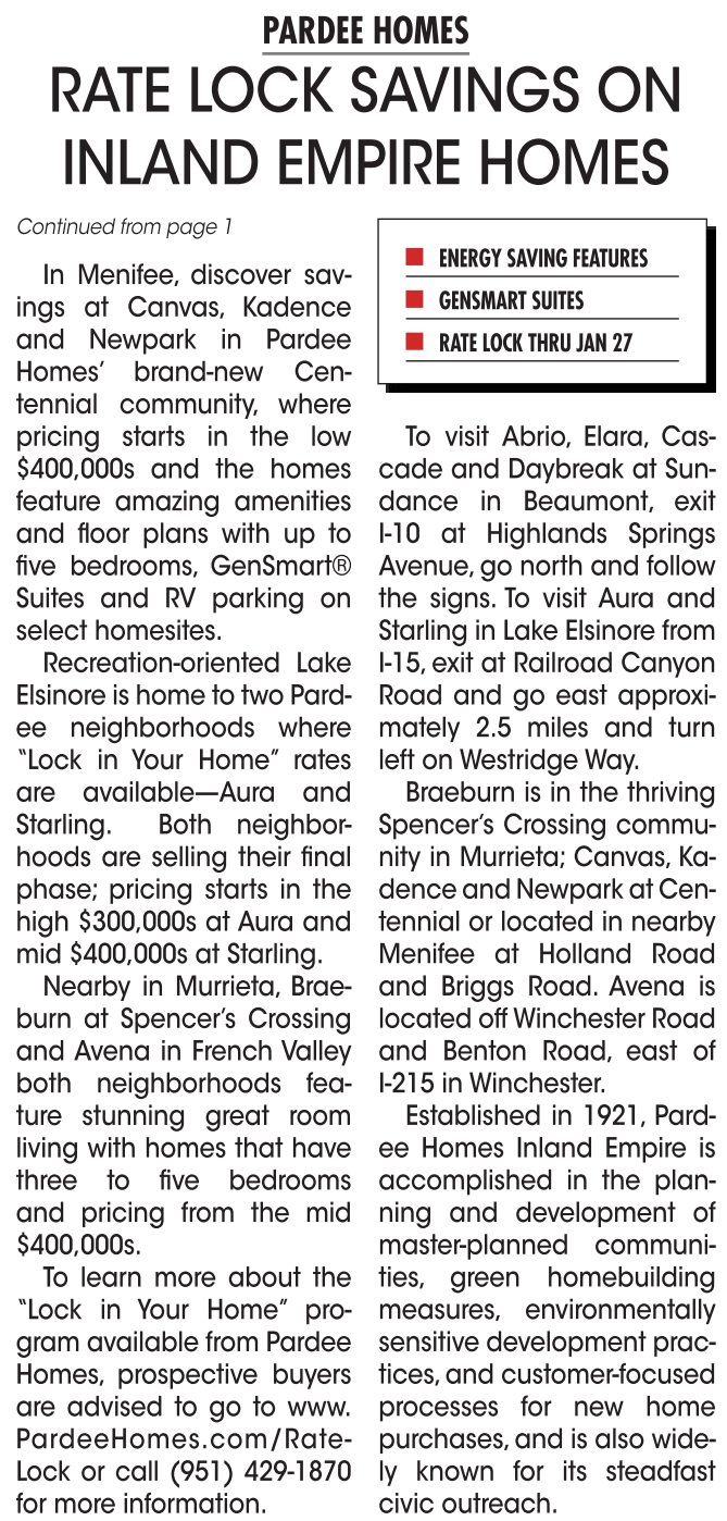 To learn more about the “Lock in Your Home” program available from Pardee Homes, prospective buyers are advised to go to www. PardeeHomes.com/Rate- Lock or call (951) 429-1870 for more information.