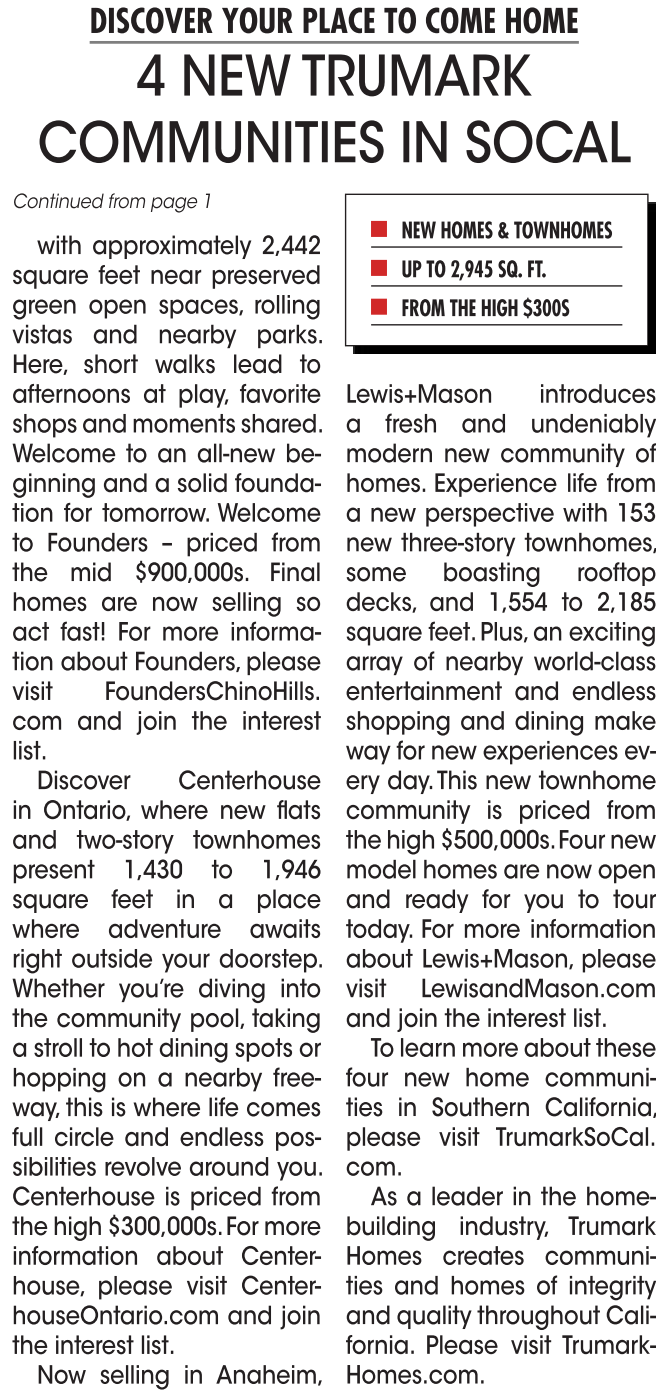 To learn moreabout these four new home communities in Southern California, please visit TrumarkSoCal. com.