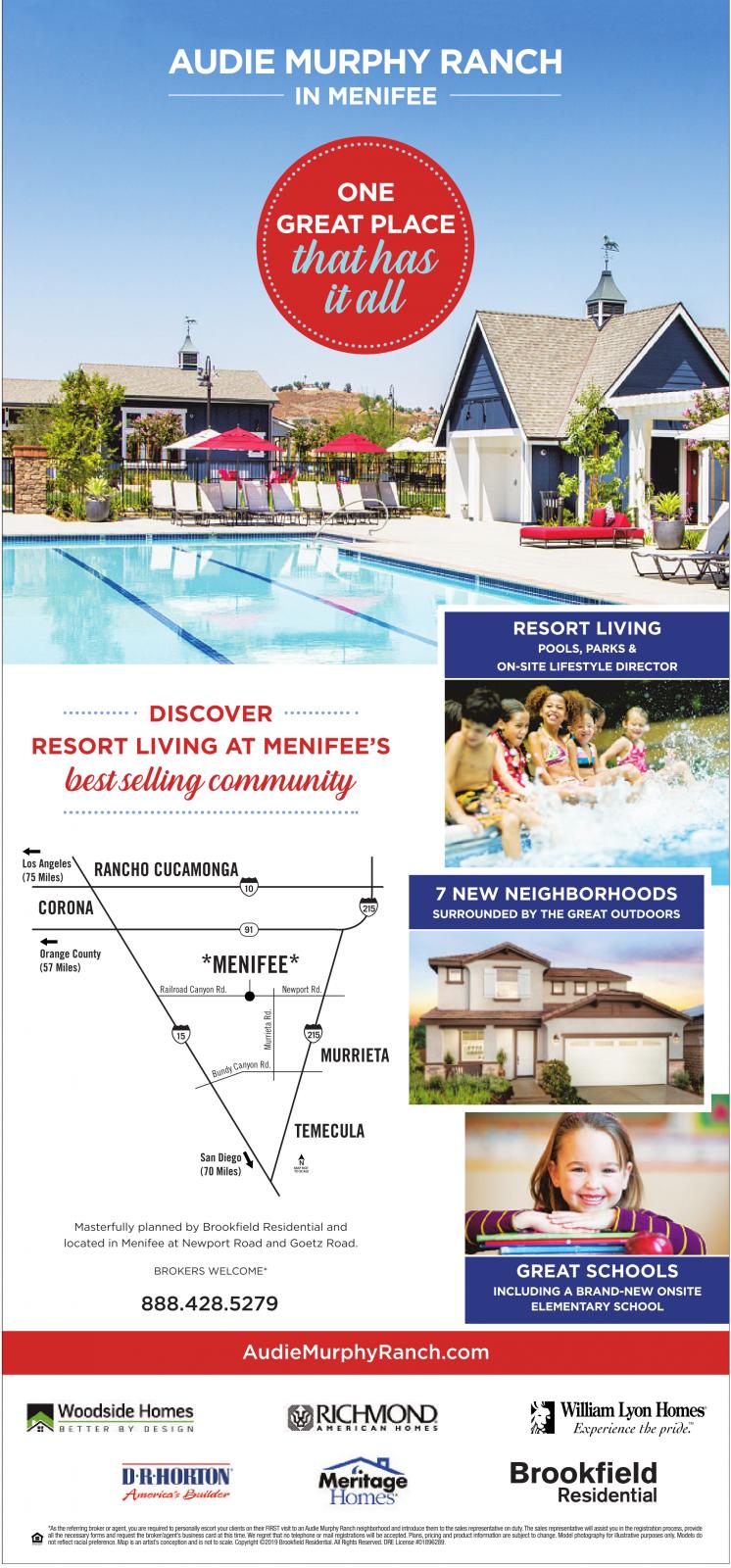 *As the referring broker or agent, you are required to personally escort your clients on their FIRST visit to an AudieMurphyRanch neighborhood and introduce them to the sales representative on duty.The sales representative will assist you in the registration process, provide all the necessaryforms and request the broker/agent’sbusiness card at this time. We regret thatnotelephone or mail registrations will be accepted. Plans, pricing and product information aresubjecttochange. Model photography for illustrativepurposes only.Models do not reflect racial preference. Mapisanartist’s conception and is nottoscale. Copyright ©2019 Brookfield Residential.All Rights Reserved. DRE License #01896289.