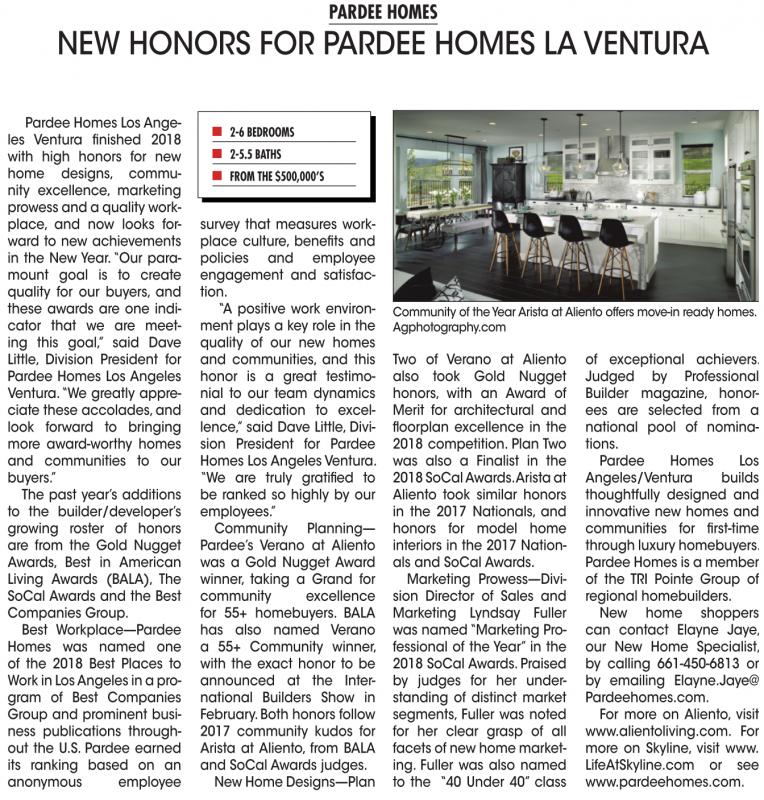 NEW HONORS FOR PARDEE HOMES LA VENTURA