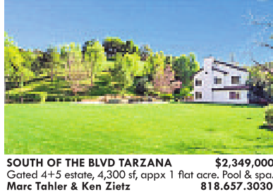 SOUTH OF THE BLVD TARZANA $2,349,000 Marc Tahler &Ken Zietz 818.