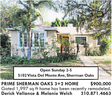 PRIME SHERMAN OAKS 3+2 HOME $900,000 Gated 1,997 sq ft home has been recently remodeled. Derick Vallance &Melanie Welch 310.871.4663