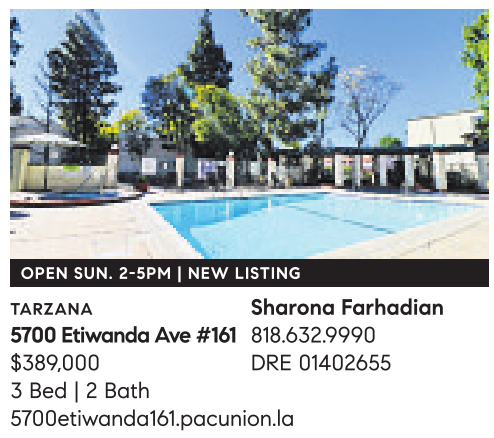 OPEN SUN. 2-5PM | NEW LISTING TARZANA Sharona Farhadian 5700 Etiwanda Ave#161 818.632.9990 $389,000 DRE 01402655 3 Bed | 2 Bath 5700etiwanda161.pacunion.la