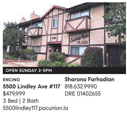 OPEN SUNDAY 2-5PM ENCINO Sharona Farhadian 5500 Lindley Ave #117 818.632.9990 $479,999 DRE 01402655 3 Bed | 2 Bath 5500lindley117.pacunion.la