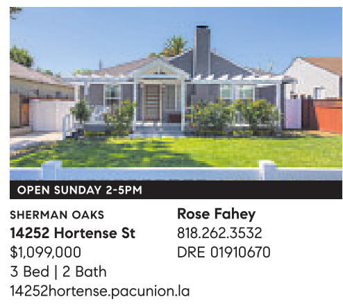 OPEN SUNDAY 2-5PM SHERMAN OAKS Rose Fahey 14252 Hortense St 818.262.3532 $1,099,000 DRE 01910670 3 Bed | 2 Bath 14252hortense.pacunion.la