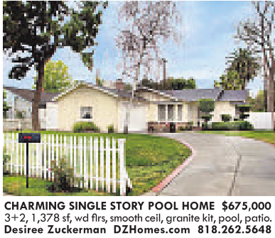 CHARMING SINGLE STORY POOL HOME $675,000 Desiree Zuckerman DZHomes.com 818.262.5648