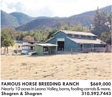 FAMOUS HORSE BREEDING RANCH $669,000 Nearly 10 acresinLeona Valley, barns,foaling corrals &more. Shogren &Shogren 310.592.7443