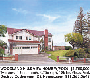 WOODLAND HILLSVIEW HOME W/POOL $1,750,000 Twostory 4Bed, 4bath,3,756 sq ft, 18k lot, Views,Pool. Desiree Zuckerman DZ Homes.com 818.262.5648