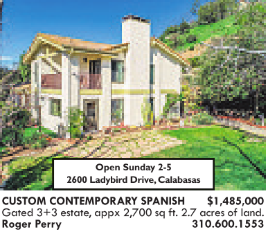 CUSTOM CONTEMPORARY SPANISH $1,485,000 Gated 3+3 estate,appx 2,700 sq ft. 2.7 acres of land. Roger Perry 310.600.1553