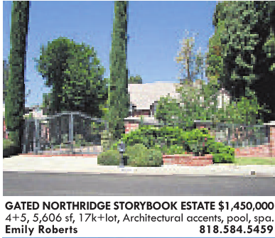 GATED NORTHRIDGE STORYBOOK ESTATE$1,450,000 4+5, 5,606 sf,17k+lot, Architectural accents,pool, spa. Emily Roberts 818.584.5459